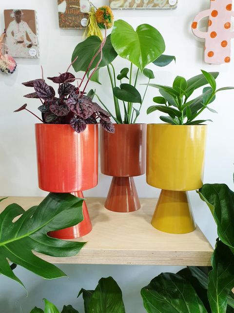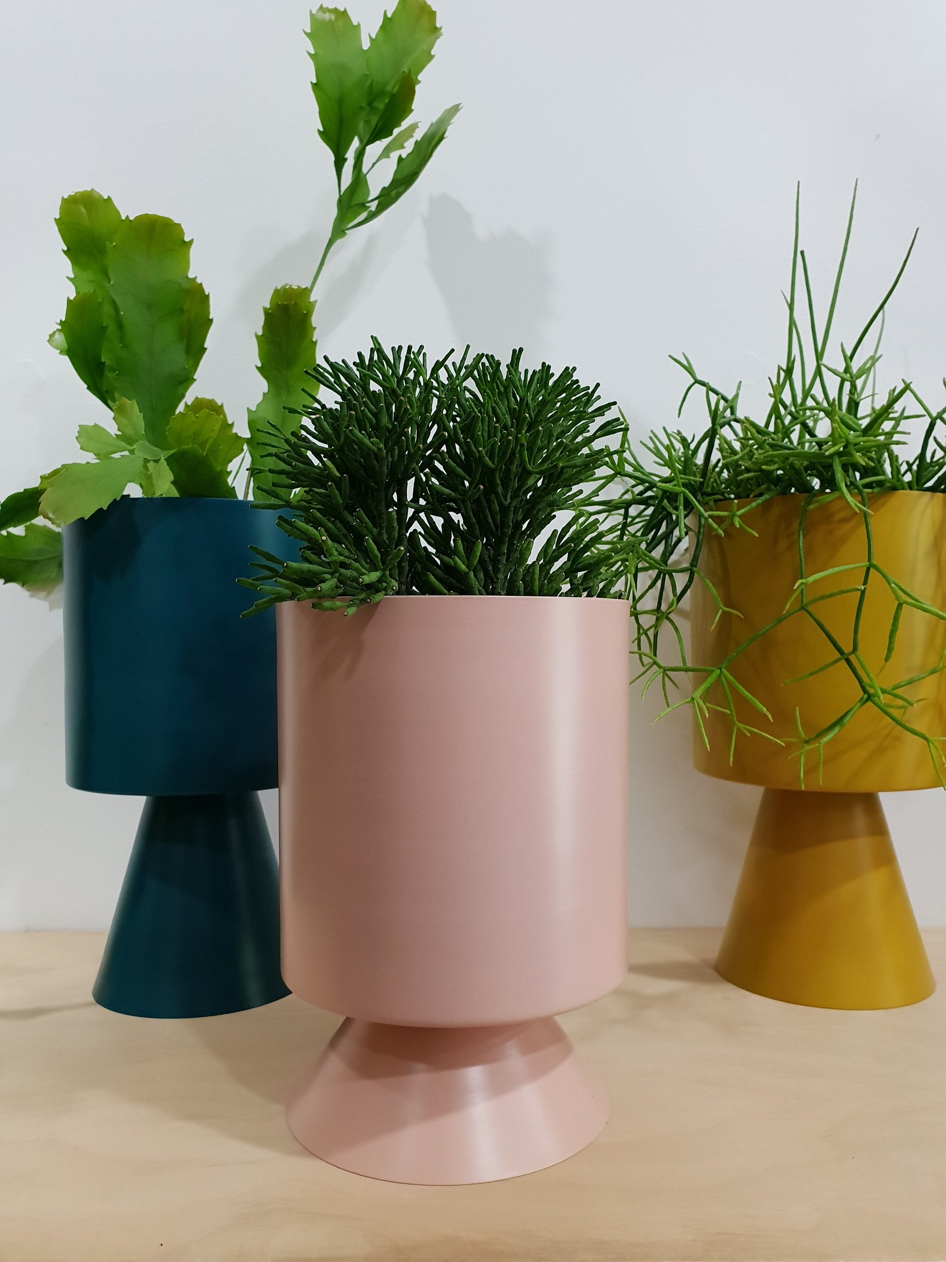 The 'Lightly' planter collection is an inspired Mid Century Modern design in the colors of Palm Springs, California. they're crafted in powder coated spun metal, + are just extremely beautiful...